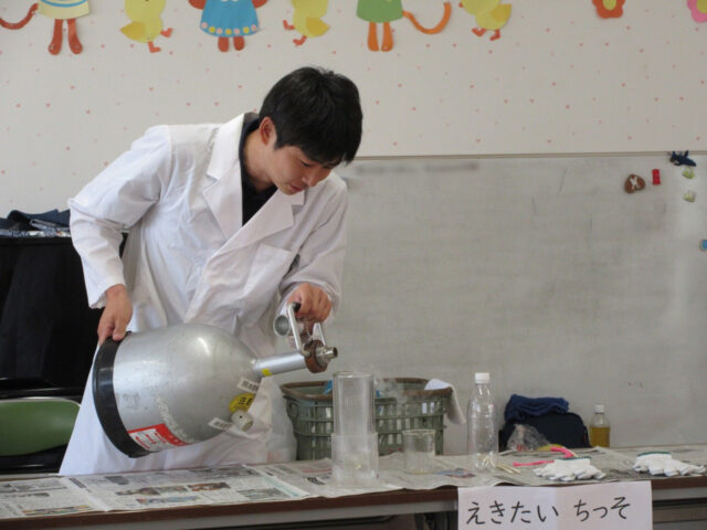 空気の成分の中で一番多い「窒素」を今回液体にして持って来てもらいました。