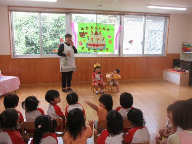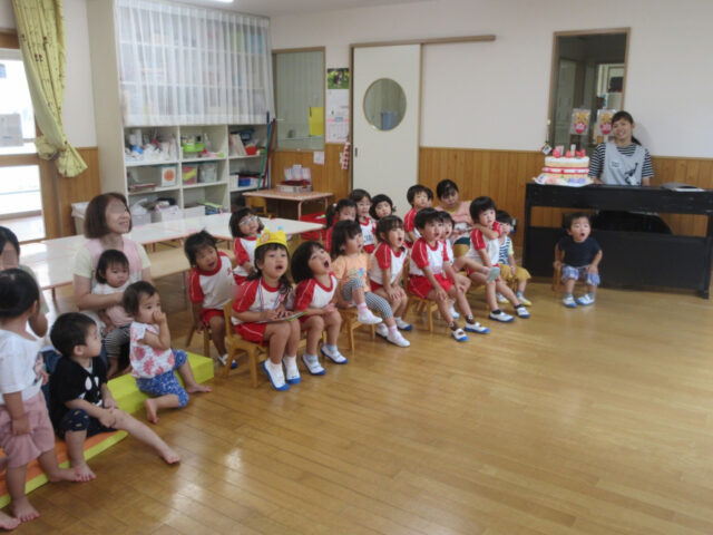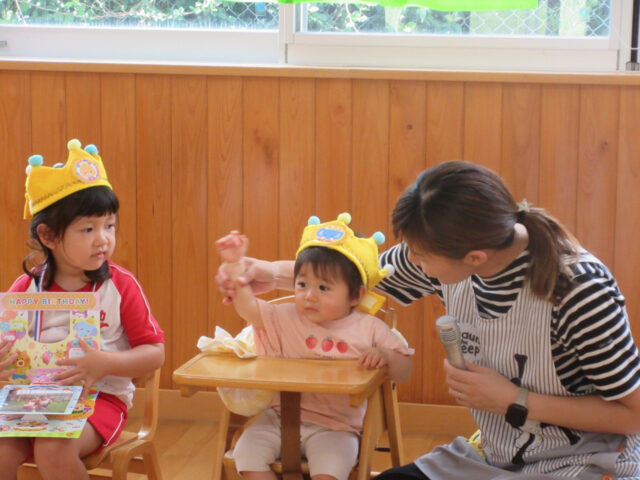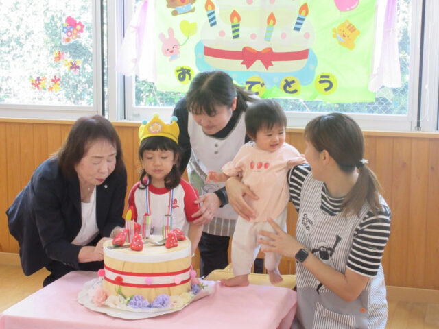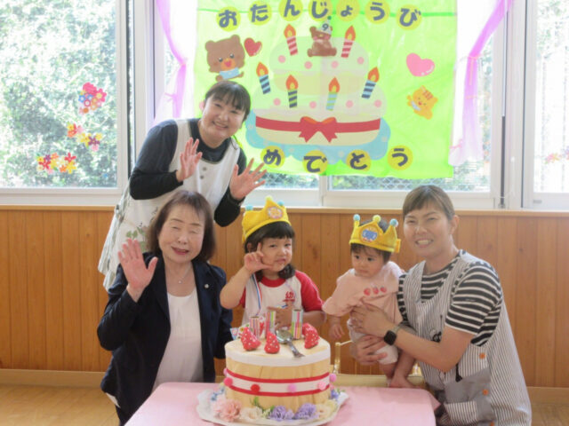 1歳になったひよこ組さんと3歳になったいちご組さんの可愛い女の子二人をみんなでお祝いしましたよ!