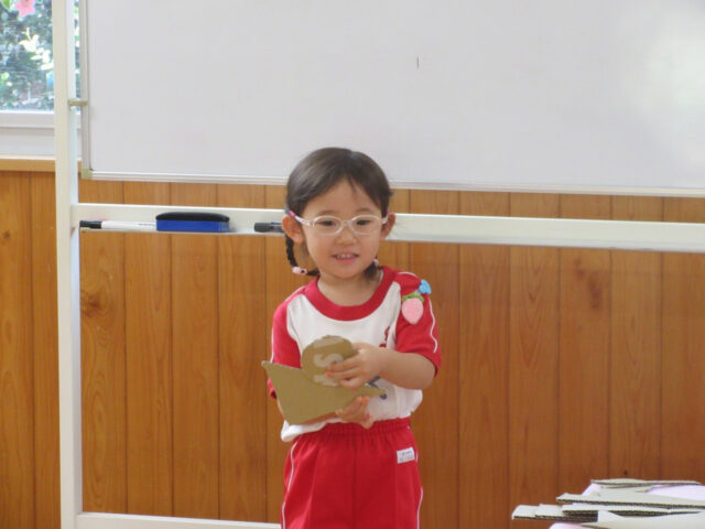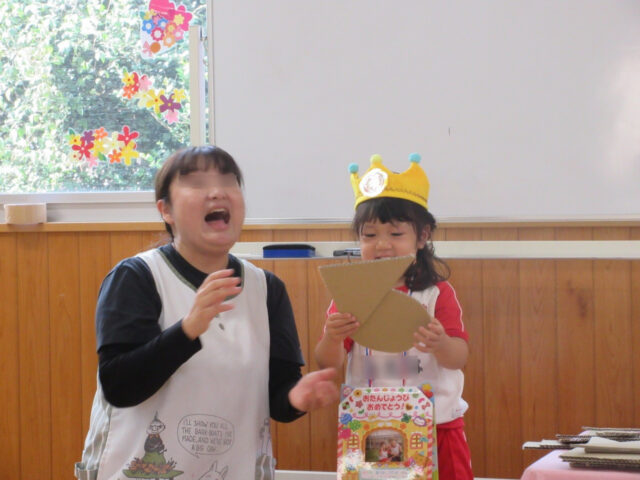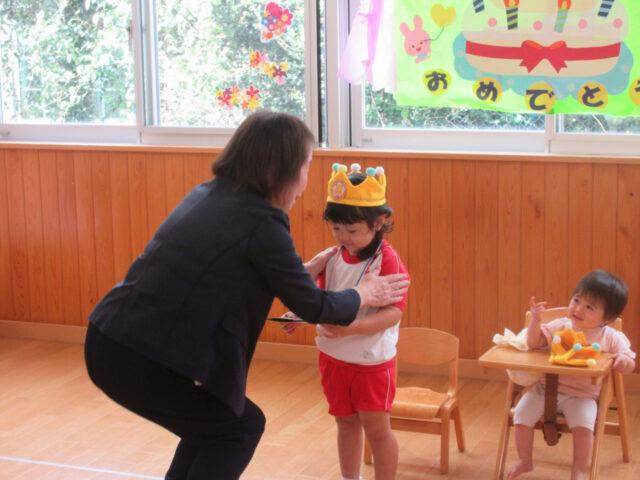 いちご組さんはさすが!!しっかり自分の名前を言う事ができ、プレゼントのカードも園長先生にかけてもらってとっても嬉しそう!