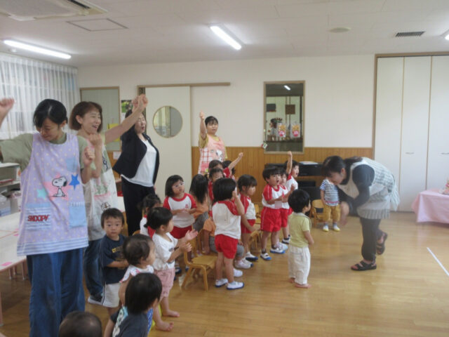 ひよこ組さんも先生と一緒に「1歳になりました~」と表現!みんなに「おめでとう!」の声を掛けられると「わ~キャッ!キャッ!」と体いっぱいに嬉しさを表現していました。