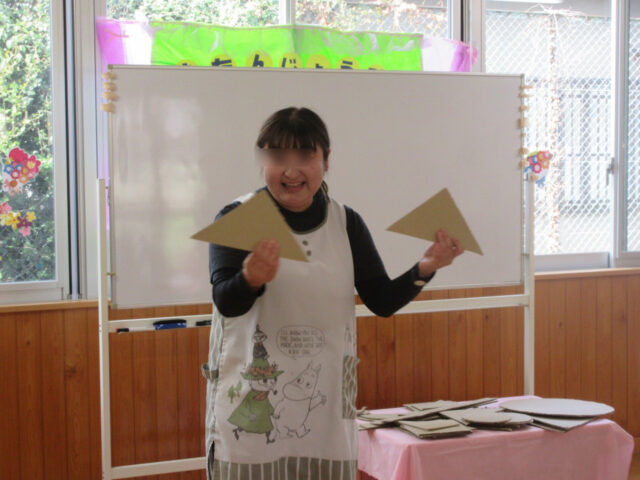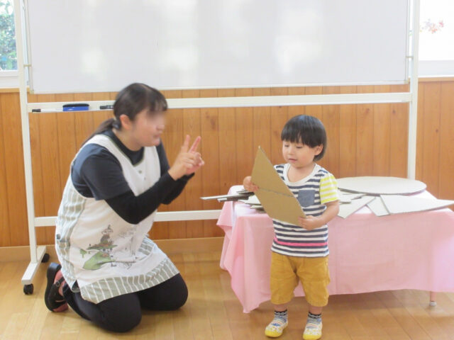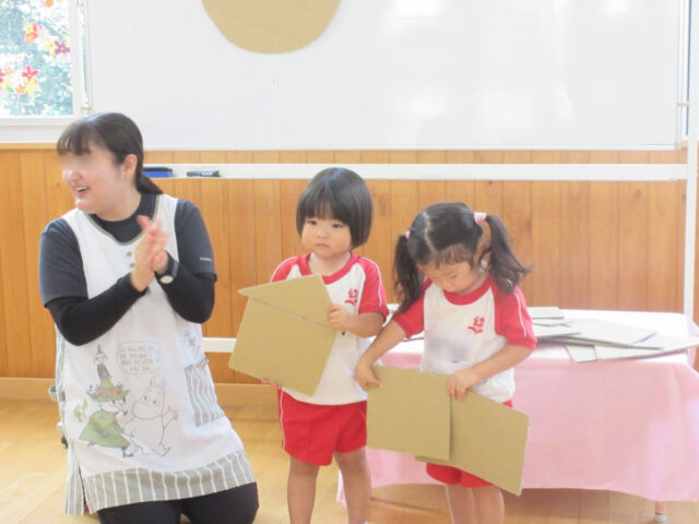 「な~にが出来るかな?何が何ができるかな?」と軽快なリズムに合わせて丸や三角、四角などを使って表現遊びです。