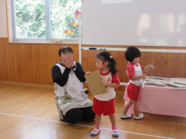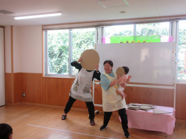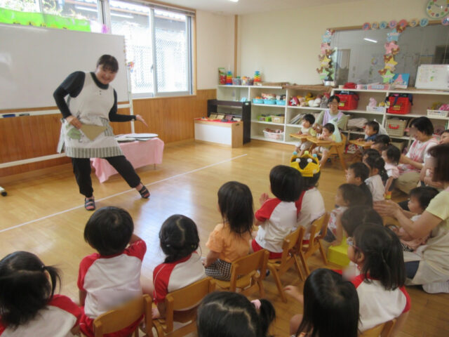 お祝いの歌で盛り上がって、さぁ!お楽しみの先生達からのお話タイム!今回のお話は・・・・。