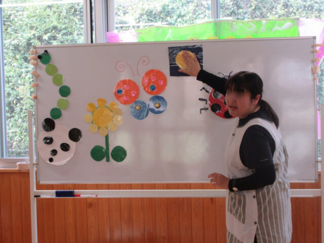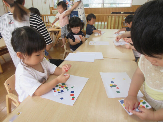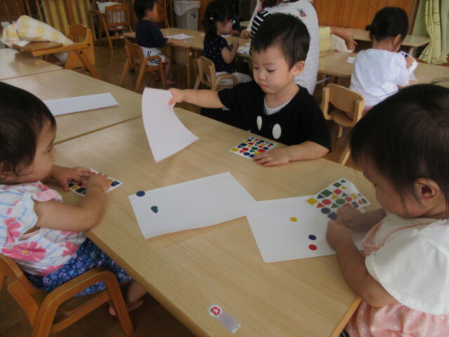 お誕生会のあと、ひよこ組さんはシールを使って「何が出来るかな?」で遊びました!見た後に実際にシールで遊んでみる。シール貼りが主ですが、こういった活動が創造力の土台になりますね。
