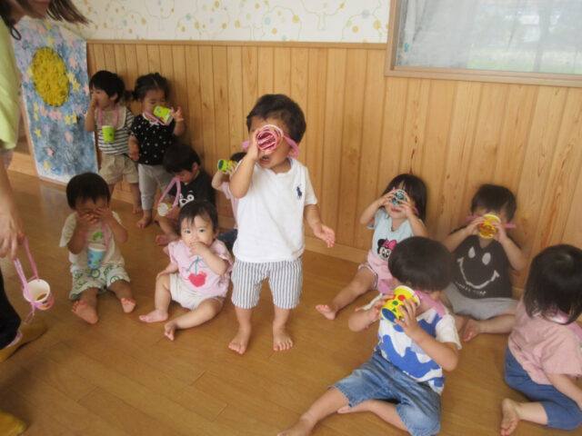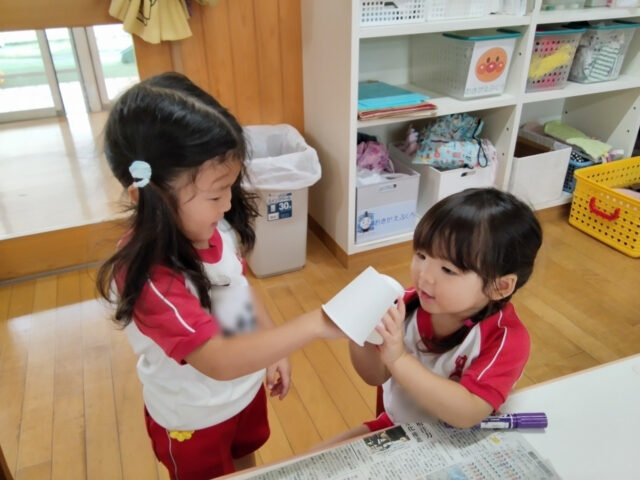 いちご組さんは、幼稚園部のぞう組の先生と一緒に遊び、可愛い紙コップのお人形を作ったようです。