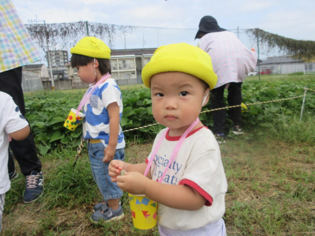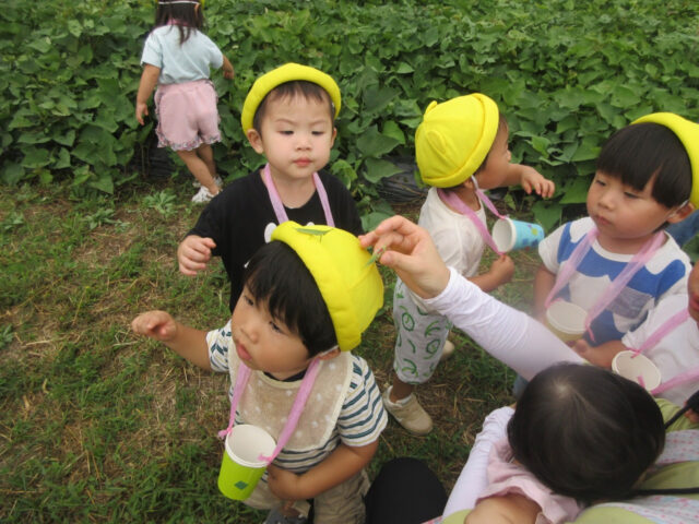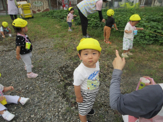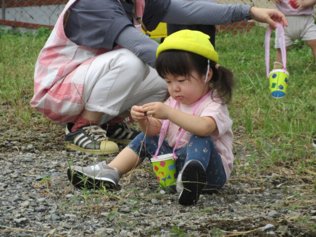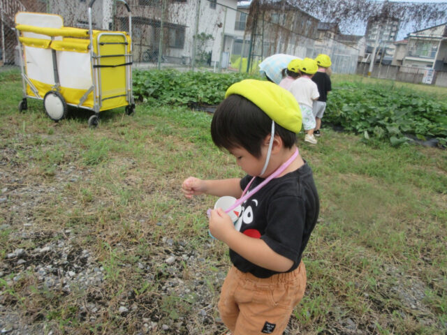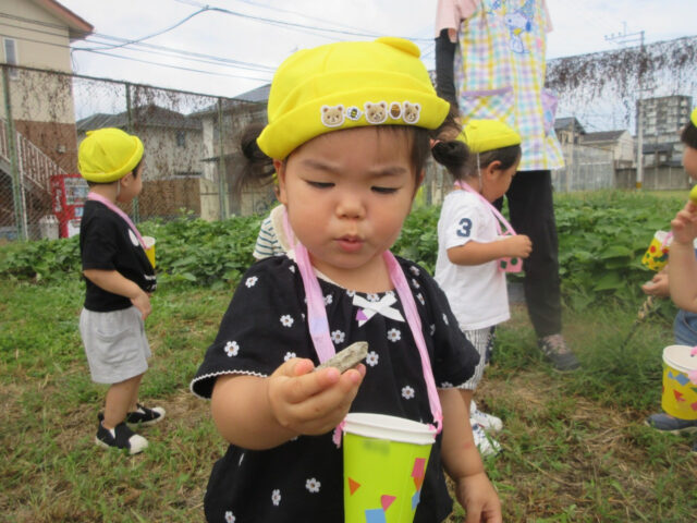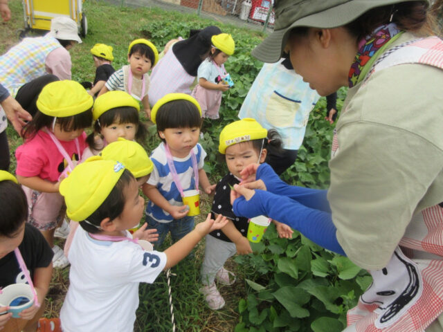 芋畑に到着すると「みて!バッタだよ!」と先生が見せるとみんなちょっと怖いけど興味津々。