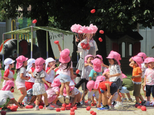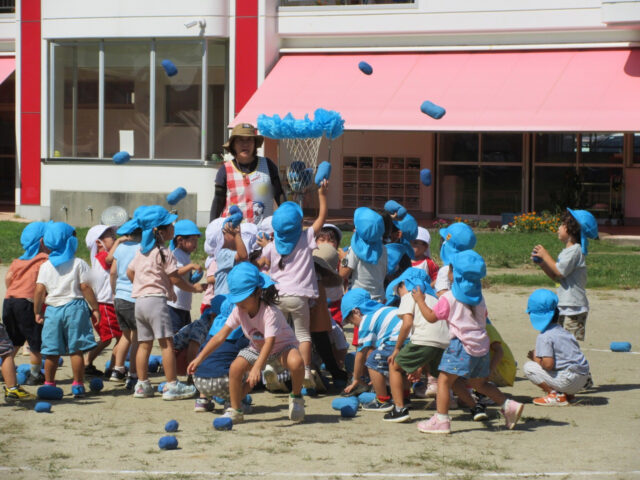 年少さんとほし組さんは2チームに分かれて巧技台の後に「玉入れ」🚩