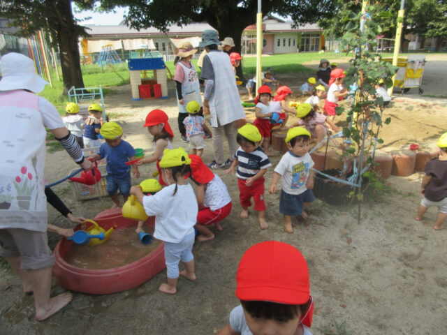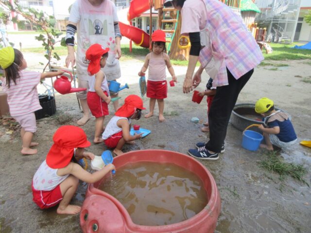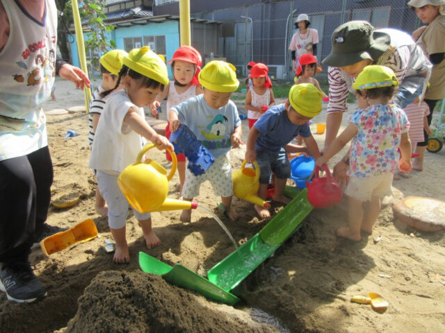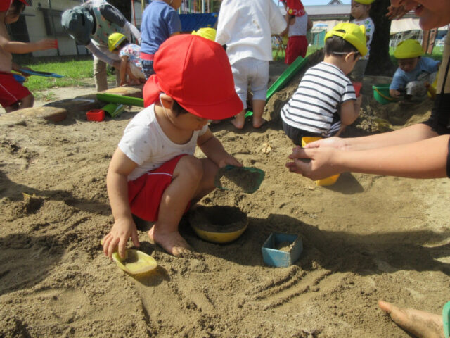 裸足になって砂の感触をしっかりと楽しみ、水も運びながらそれぞれに集中して遊ぶ様子が見られ、嬉しく思いました。