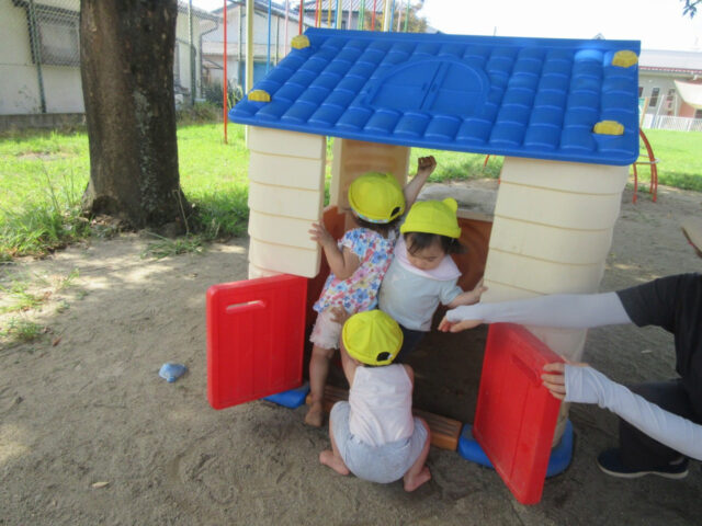 砂場近くのお家を出たり入ったりを楽しんでいるひよこ組さんの姿も見られみんなよく遊びましたね。