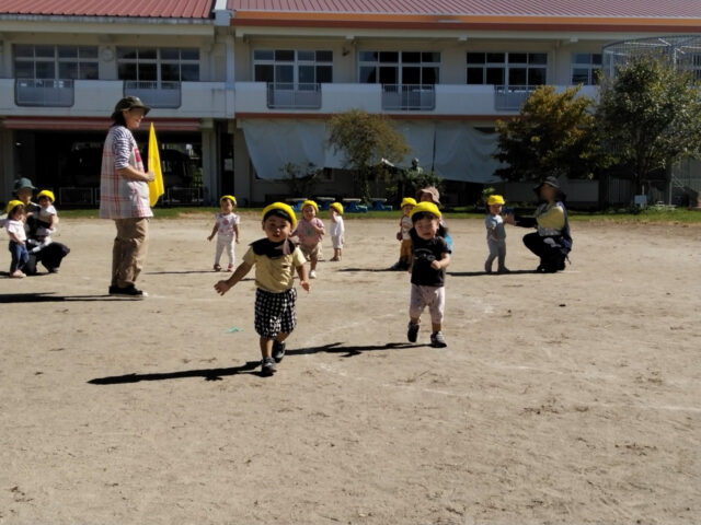 幼稚園部といちご組さんがKIP WEEk中なのでひよこ組さんは、運動会ごっこでもしようかな・・・。と、今日はかけっこに挑戦。