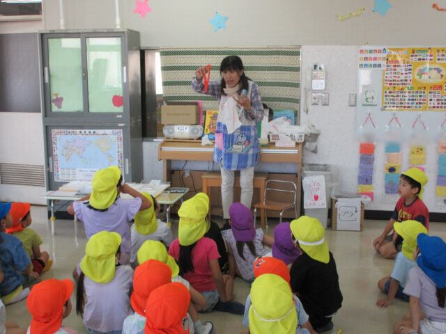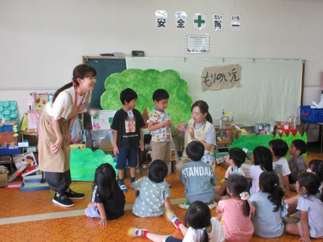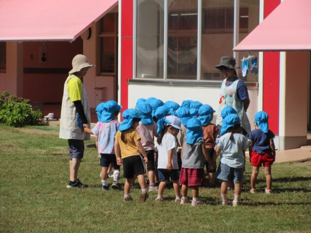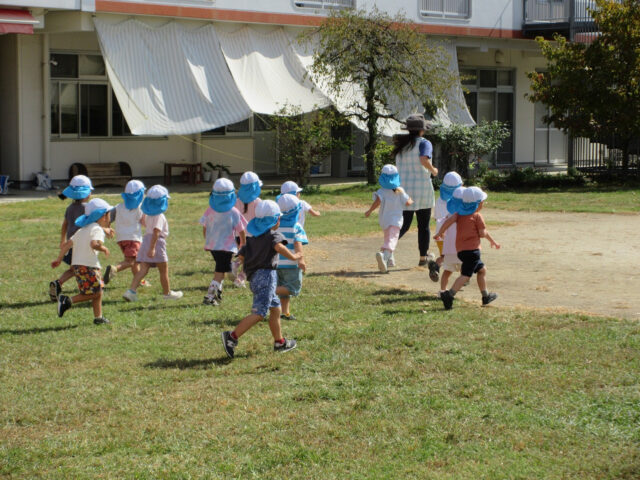いちご組さんも園庭に出てきて、しっぽとりゲームをした後に・・・