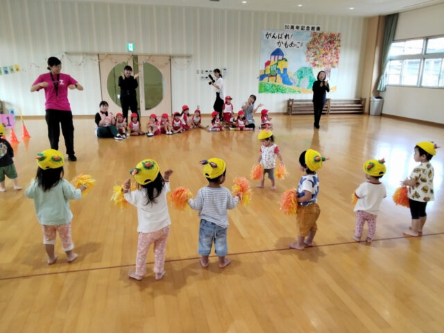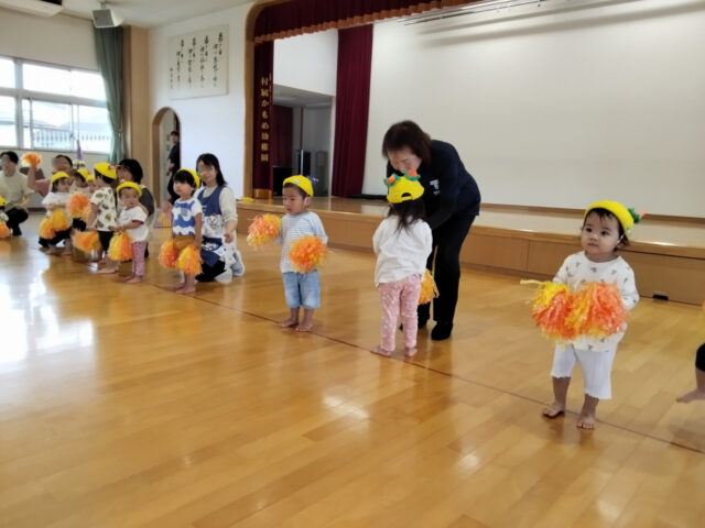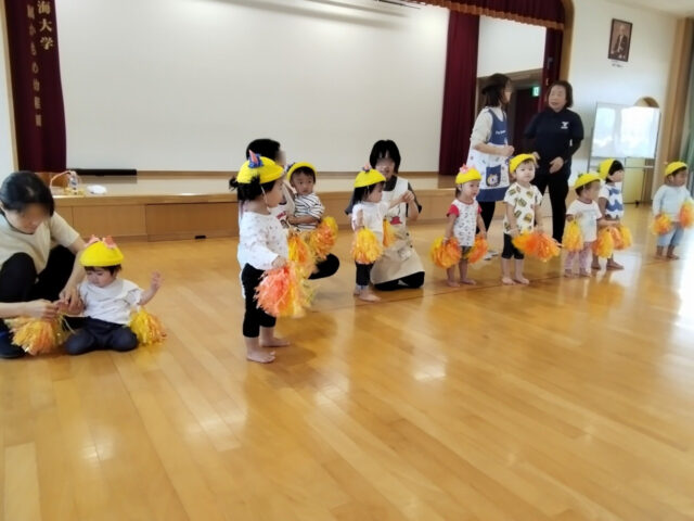 昨日、今日の応援の為に作った鳴り物を持って、賑やかにダンスを披露してくれました。最後は「がんばれ~ひよこ組」の掛け声で盛り上げてくれました。