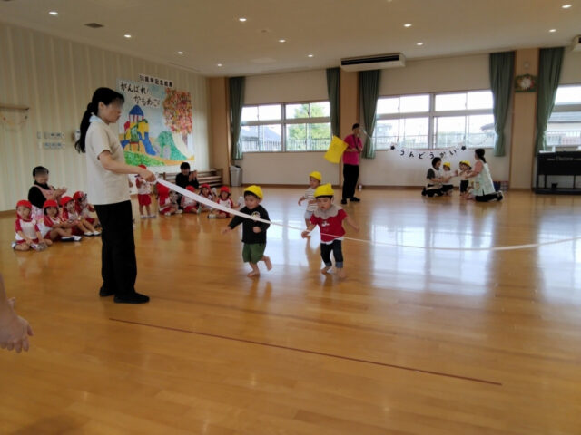 ひよこ組さんも負けてはいないぞ!お名前を呼ばれて「よ~いどん!」の掛け声と共に、しっかりゴールまで走ることが出来ていましたよ。