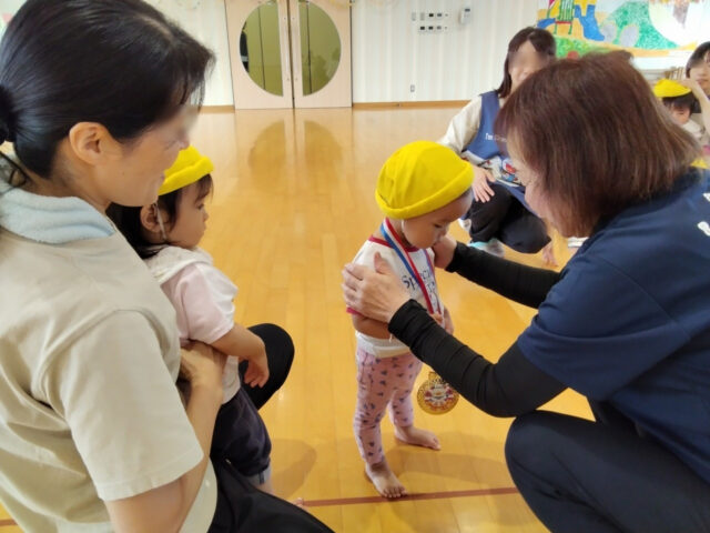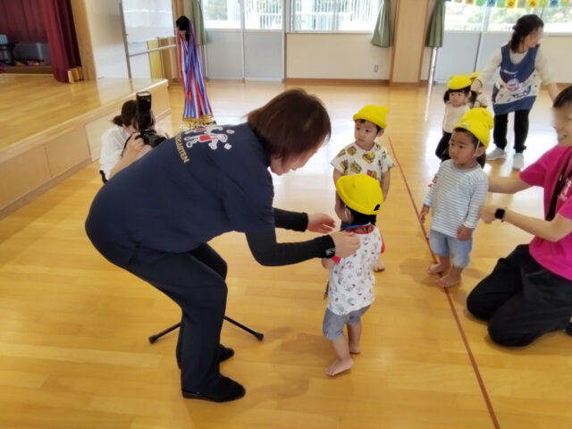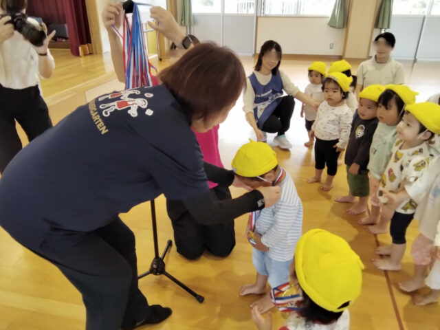 名前を呼ばれて「は~い!」とお返事して園長先生の前に立ち、ご褒美メダルをかけてもらいました。