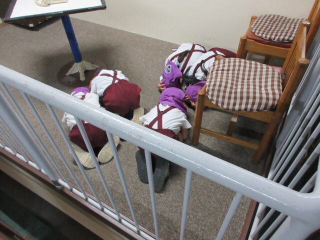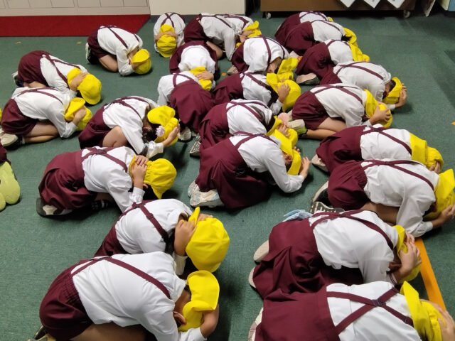 地震が起きた時の防御ポーズを教えてもらったり・・・(頭をしっかり守ることが大事)