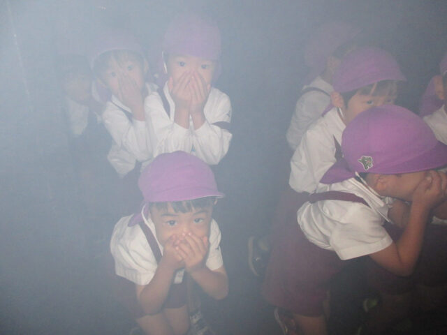 実際に、暗い部屋に入り煙も発生!!姿勢を低くして口元をおさえ、出口を目指します。