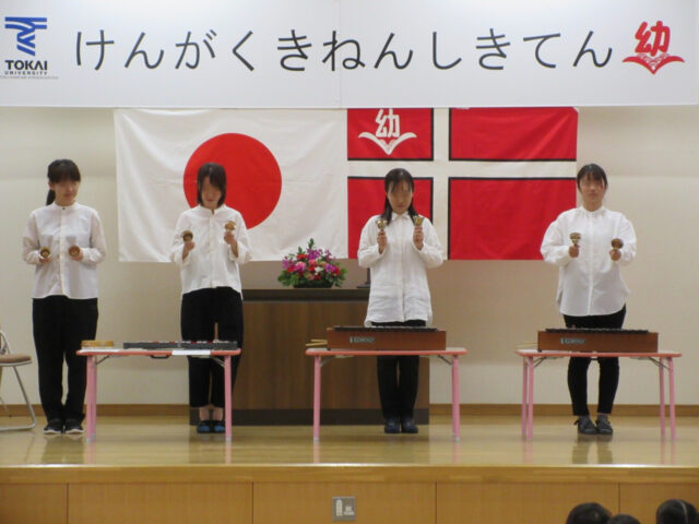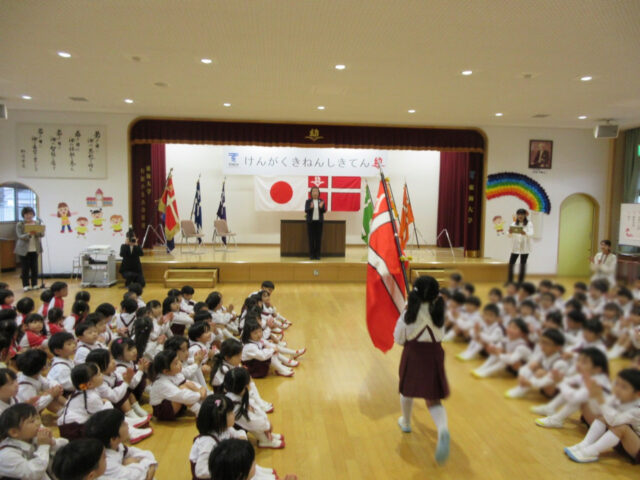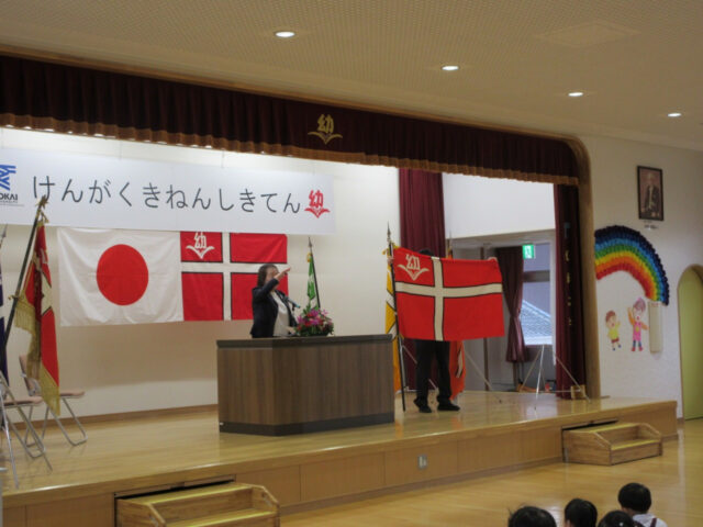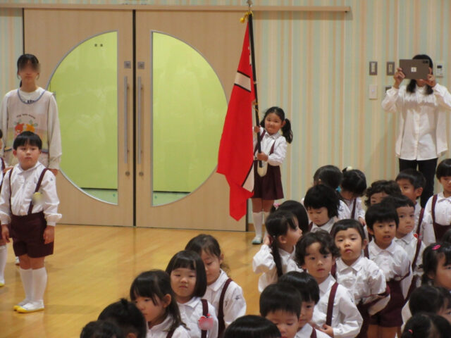 かもめ幼稚園の赤い旗のお話や東海大学にある学校の旗の色のお話があり、みんなで自分達の園のことについて学ぶ良い機会となりました。