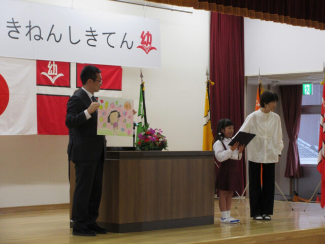 東海大学の松前重義記念基金の奨学金事業である「建学記念絵画」に年長さん全園児が絵を描いて応募し、見事!「優秀な作品です」と選ばれたお友達の表彰がありました。