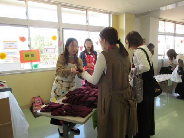 ホールの出口近くでは、制服のリサイクルコーナーがありました。