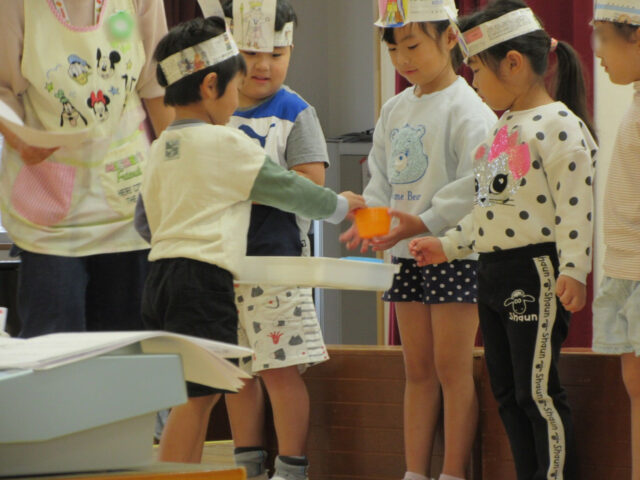 ひばり組さんは「きたかぜのくれたテーブルかけ」のお話です。