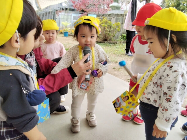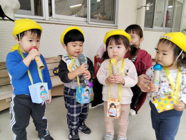 先週まではいちご組さんが頑張り、今週に入って0・1歳児クラスのひよこ組さんもマイクお当番を楽しんでいます。