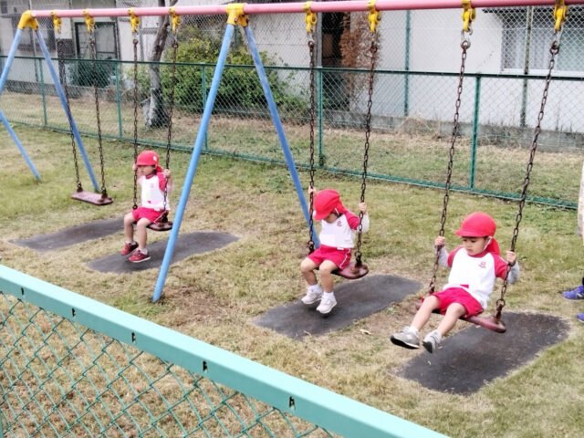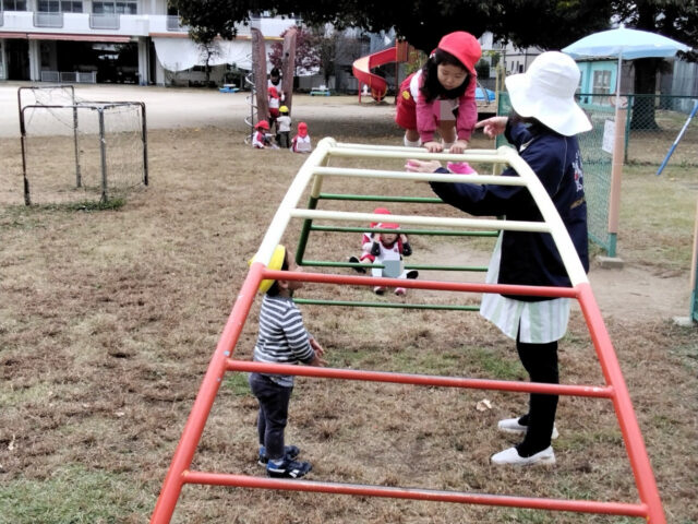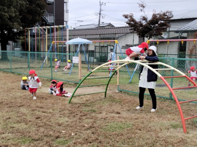 いちご組さんは、固定遊具に取り組み身体をたくさん動かしていますよ!