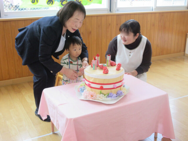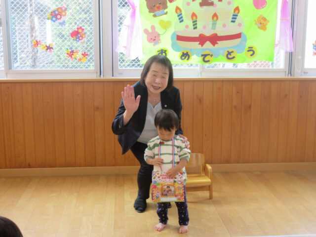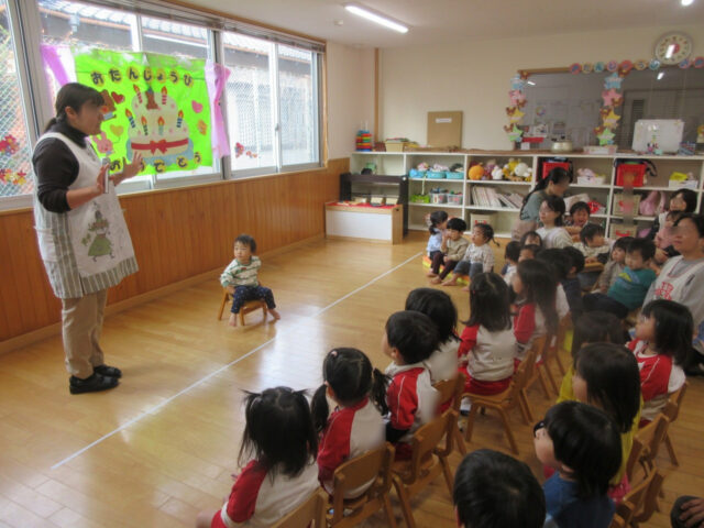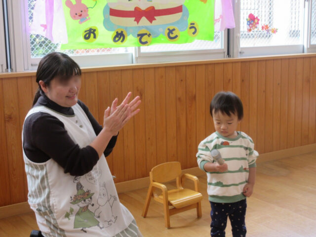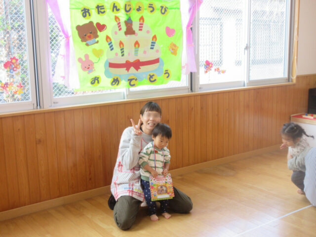今日は11月生まれさんのお誕生会。保育部は、ひよこ組の男の子一人をみんなで「おめでと~う!」ってお祝いしましたよ。