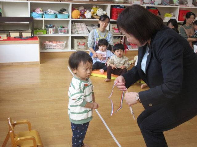 みんなに見守られてちょっぴりドキドキよりも、「ん?なんだ、なんだこの感じ」といった様子で、なんと!お名前も「〇〇です・・・ムニャムニャ」としっかり言えました。