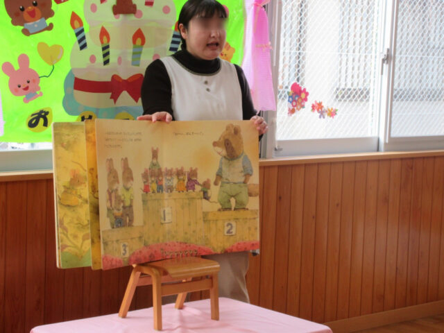 先生達から「お話のプレゼント」で大型絵本を読んでもらいました。