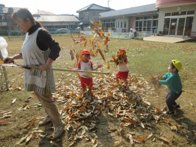 園庭の落ち葉拾いをしながら、葉っぱのベッド。