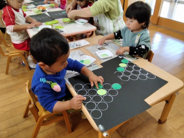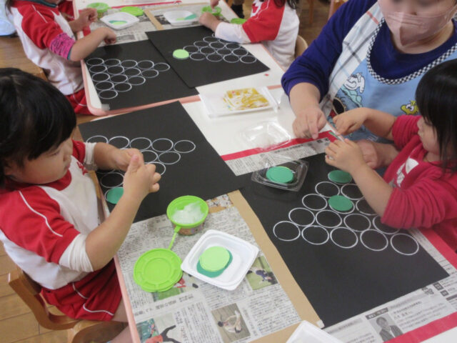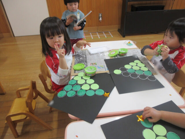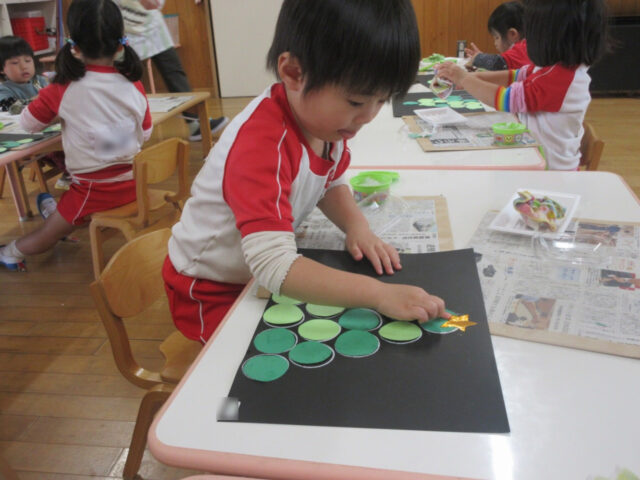 糊を使ってツリーの形にしていく製作。みんな根気強くたくさんの〇に糊をつけて、よく集中しているいちご組さん。