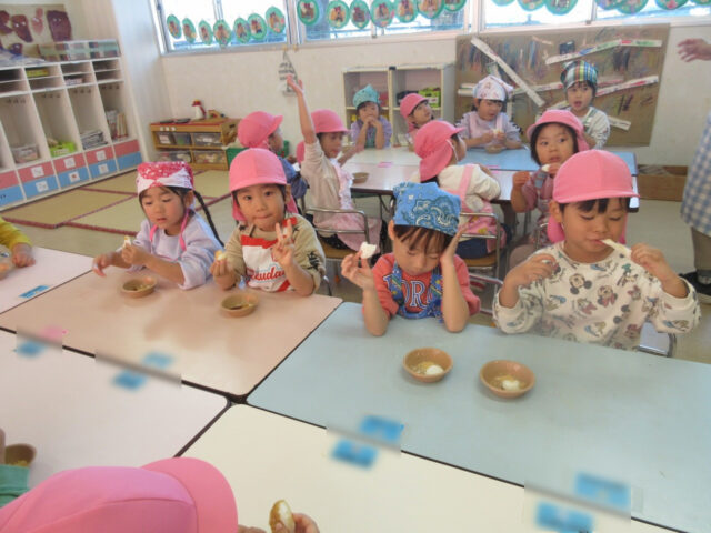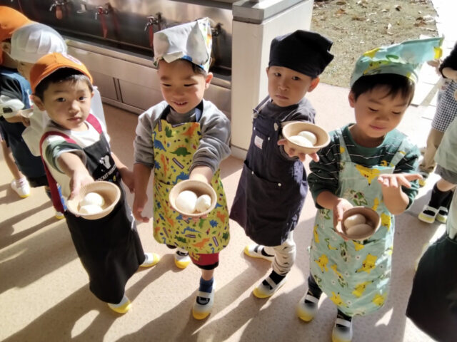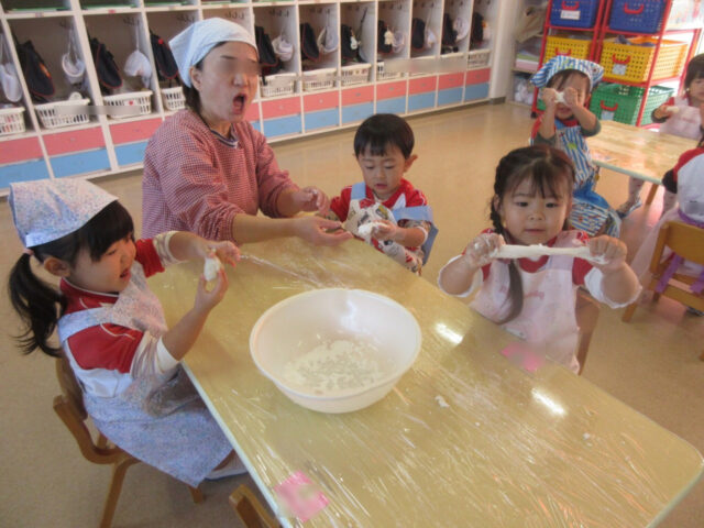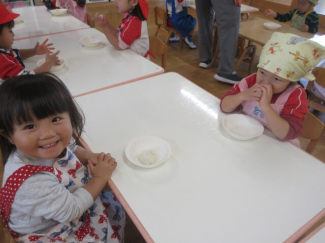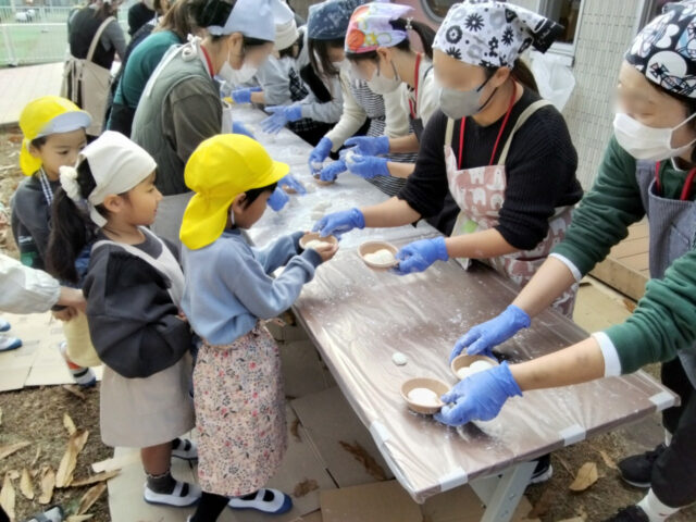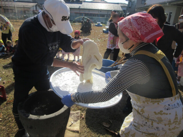 ついたお餅は「こうやってちぎって丸めていきますよ~」と園長先生の教えがあり・・・。「皆さんフムフム・・・」