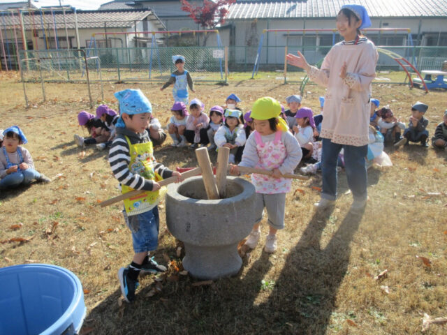 「お餅つき頑張るぞ~!」みんな楽しみにしていたようで、エプロンをつけて張り切っています。