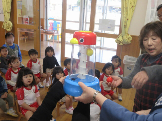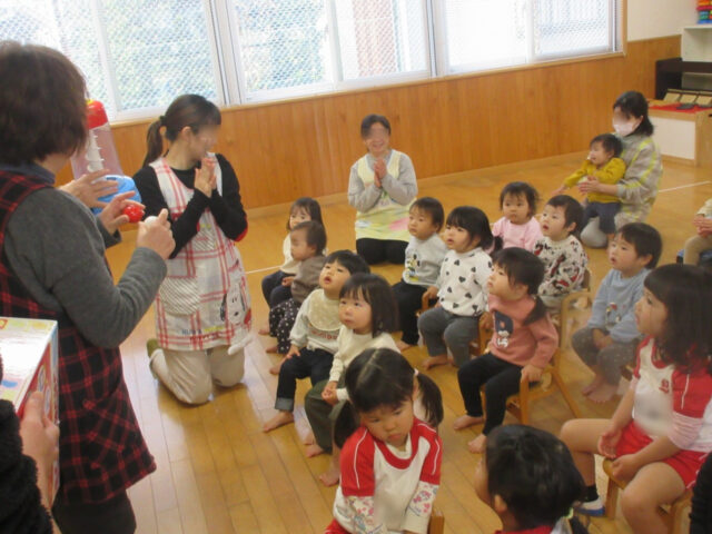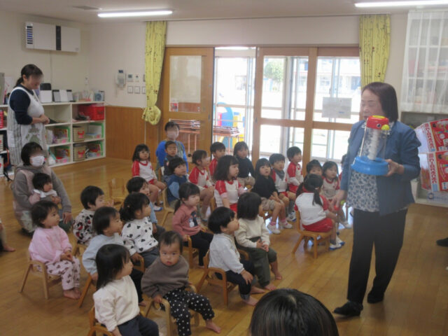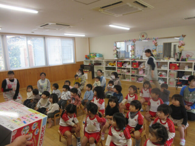 と言ってはみましたが、この集中力は、何やらみんなが気になる物を園長先生達が持って来てくれたようで、みんなの目が釘付け。
