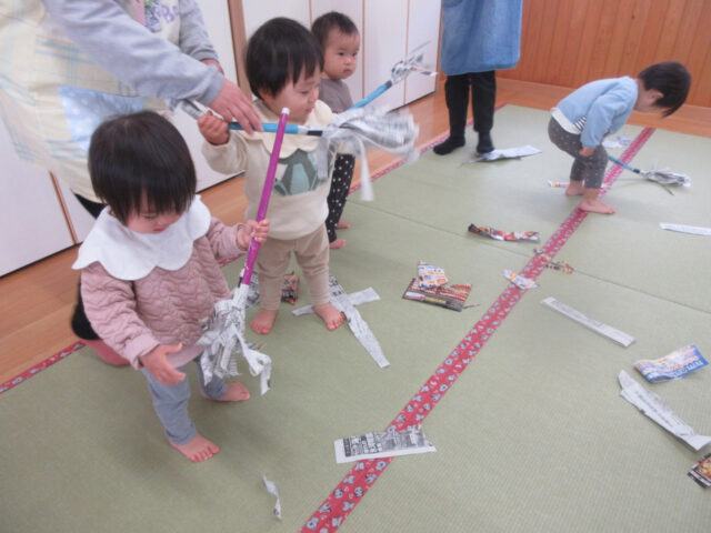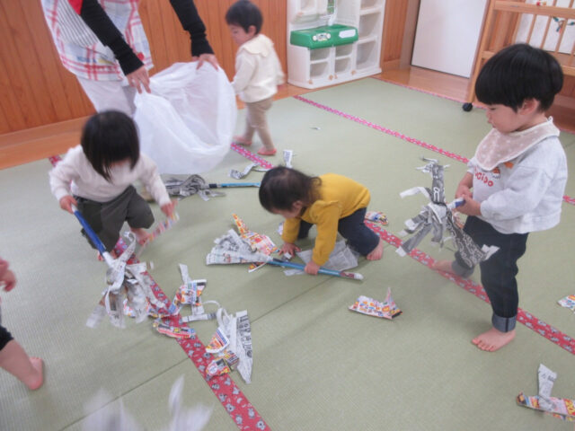 手作りほうきでちぎった新聞紙をサッ!サッ!