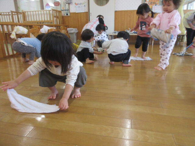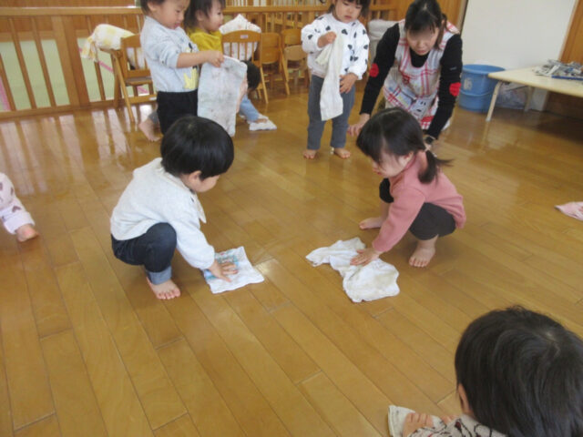終業式が終わったらひよこ組さんは「大掃除ごっこ」