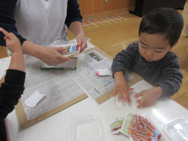 いちご組さんは、来年の干支の馬が飾られた鏡餅の製作。