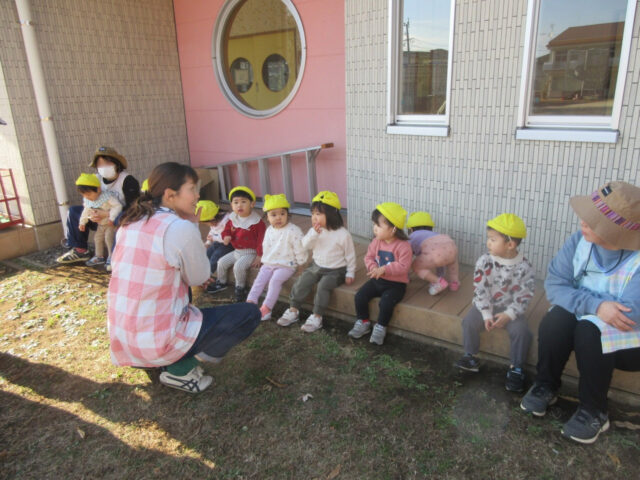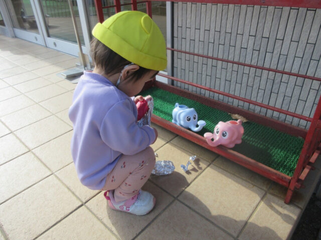 おや?みんなと離れた保育棟玄関前で座り込んで何をしているのかな?