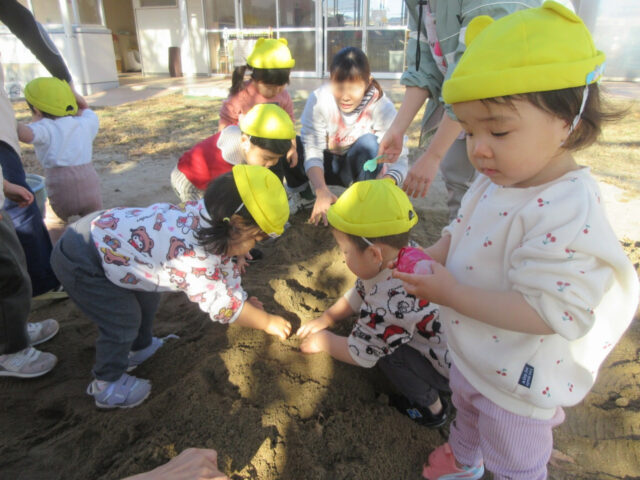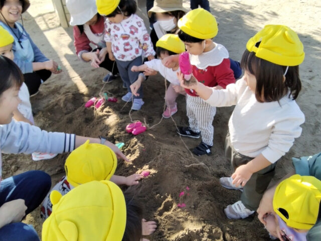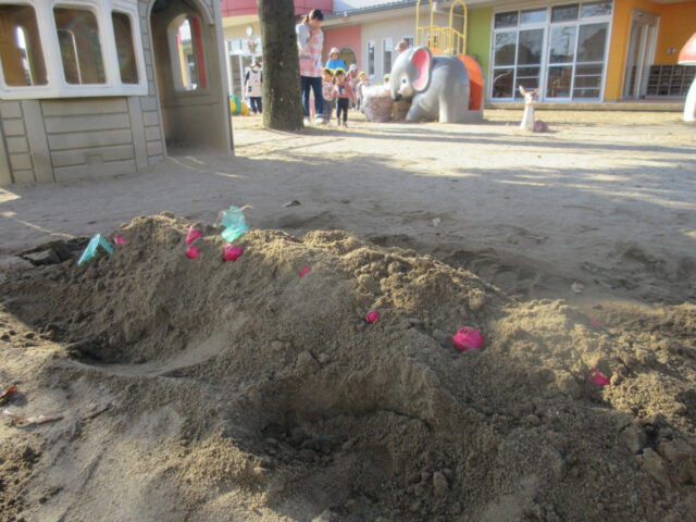 ほらほら!いつも遊んでいる砂場に何やらスタンバイO・Kで顔を出している手作りのお芋たち。
