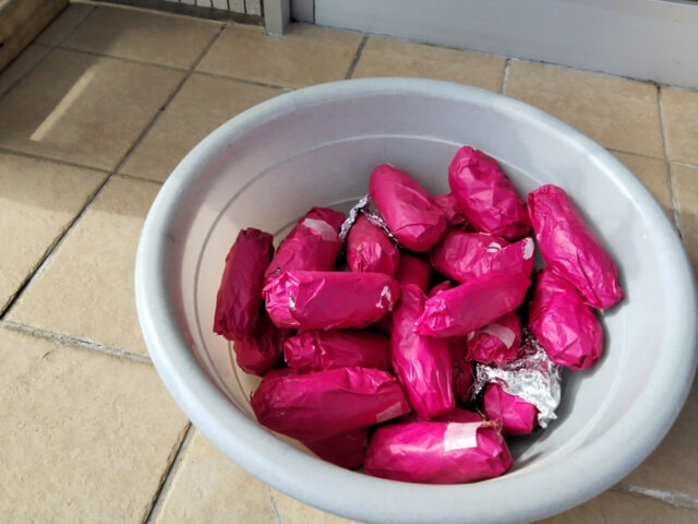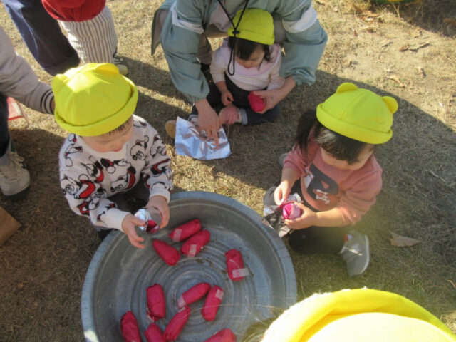 それじゃあ、みんなで焼き芋だー!アルミホイルで巻いて~巻いて~。