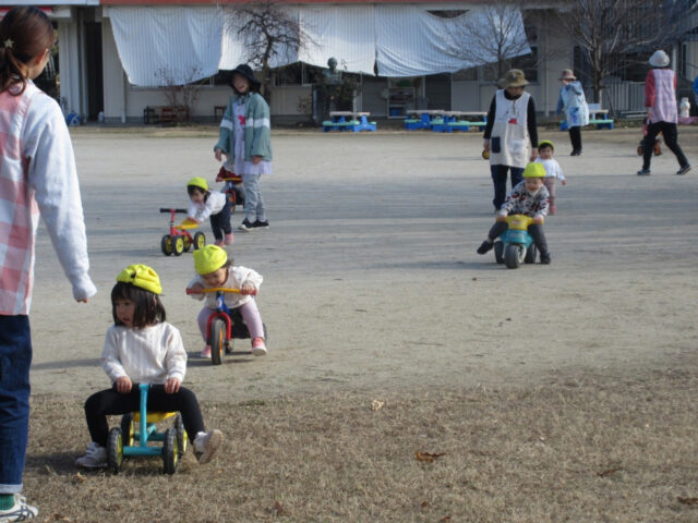 まだか!まだか!もう焼けた?ブルルン~と三輪車で遊んで待っていたひよこ軍団!たき火に戻って来たぞ!