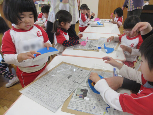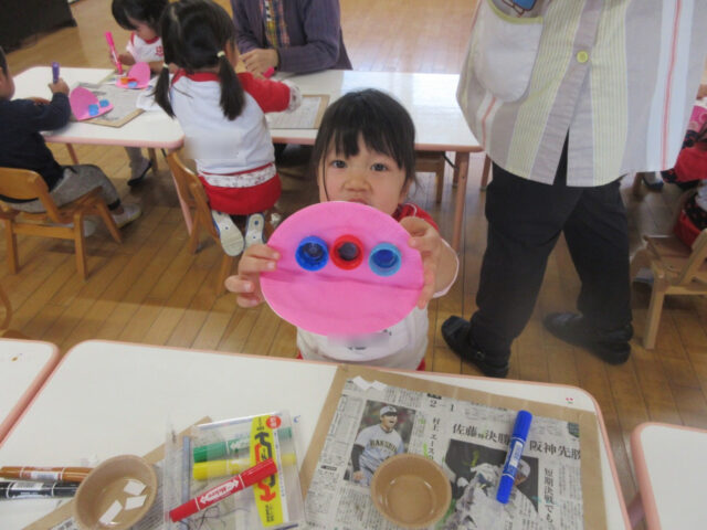 いちご組さんでは、誕生会のあと、鬼のお面製作が行われていました。