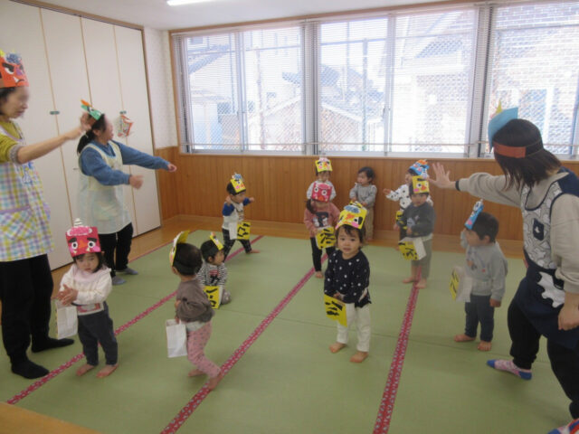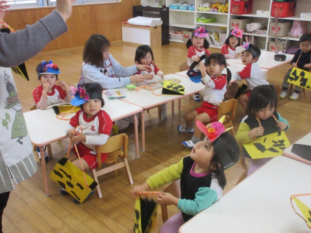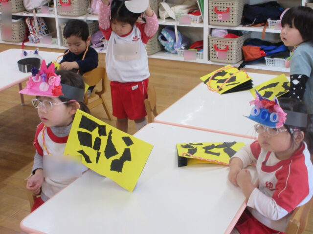 明日の豆まきに向けてスタンバイO・Kの保育部では、豆まきのリハーサルを少し行いました。