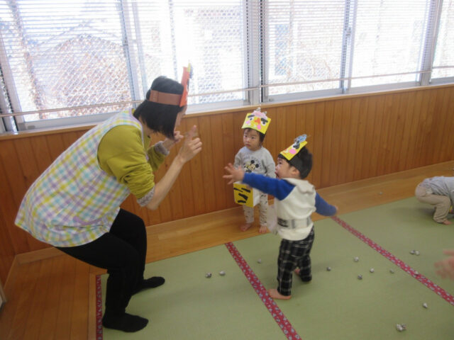 ひよこ組さんでも「オニはそと~」って投げるのよ!の練習です。