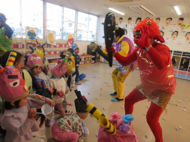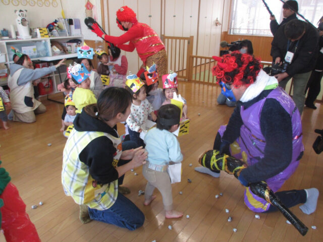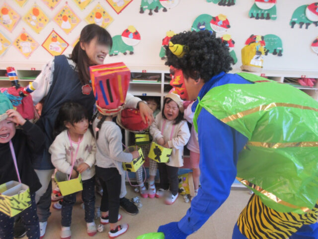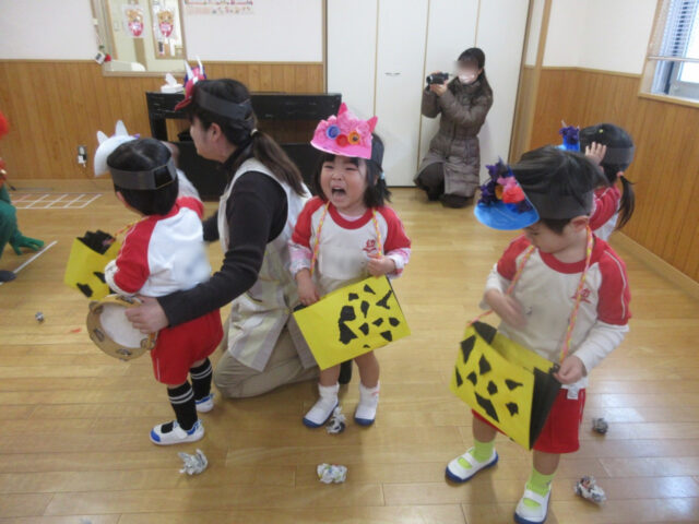 今か!いまかと待っていた保育部さんですが、鬼の登場にみんな後ずさり・・・。「オニはそと~!って豆を投げるんだよ!」と先生に前に出されたものの、「そりゃ怖い!」
