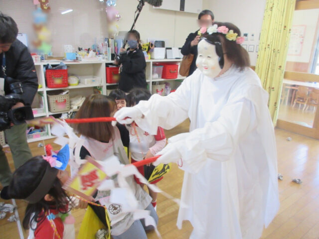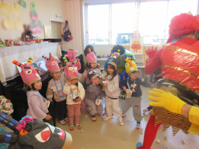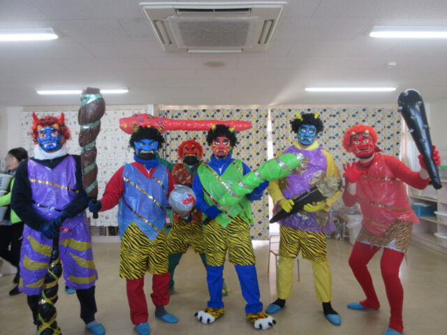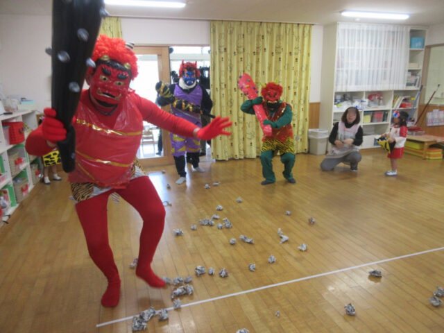 ホールで豆まきしていたら4人も鬼がやってきて、みんな大慌て。