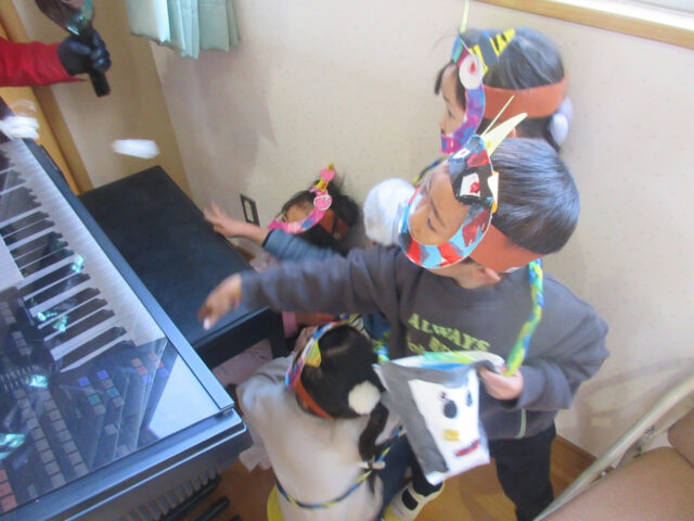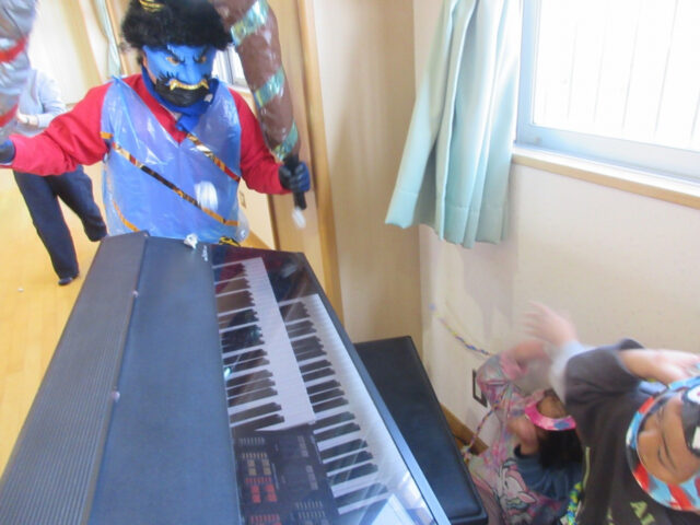 エレクトーンの後ろに隠れていたら、鬼がこっそり近づいてきて・・・。