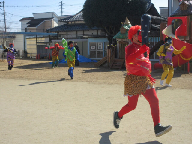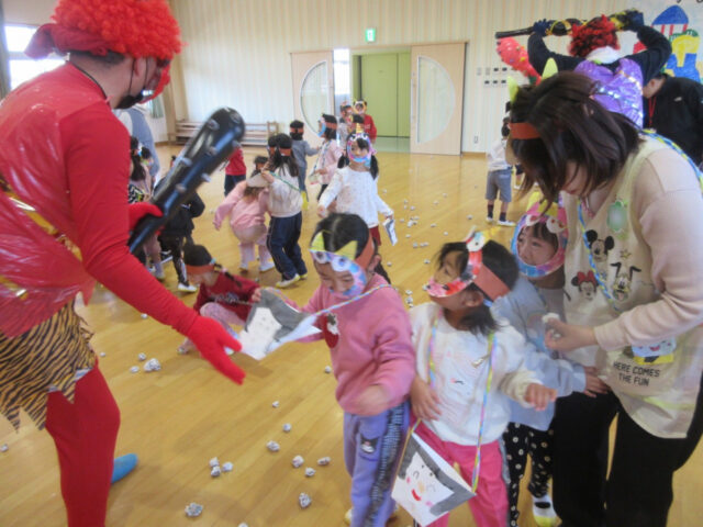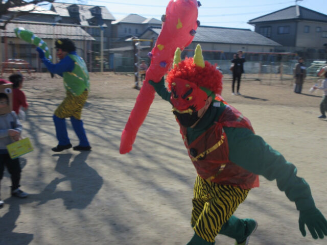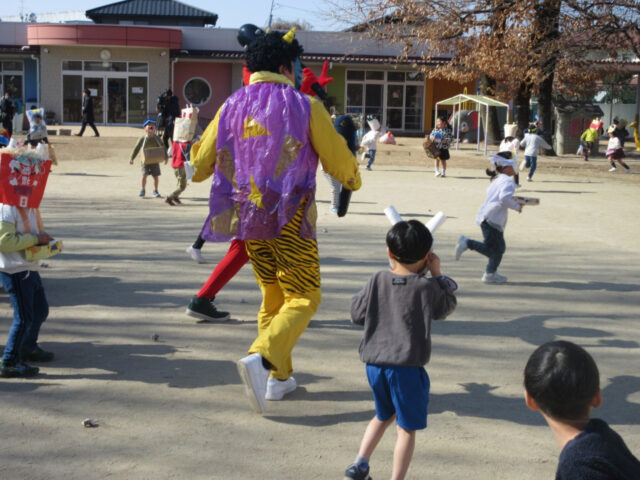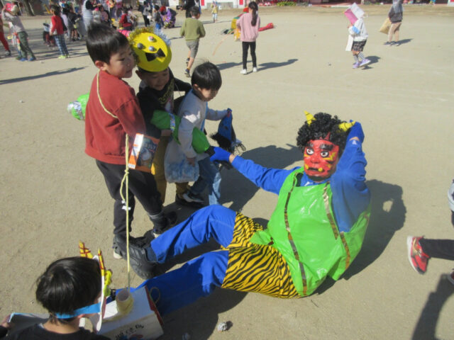 大泣きの様子も見られましたが、やっぱり年中さんは逞しくて、最後は見事鬼を倒すことが出来、倒れた後も髪の毛を引っ張る勢いに鬼さんもちょっとヘトヘトです。