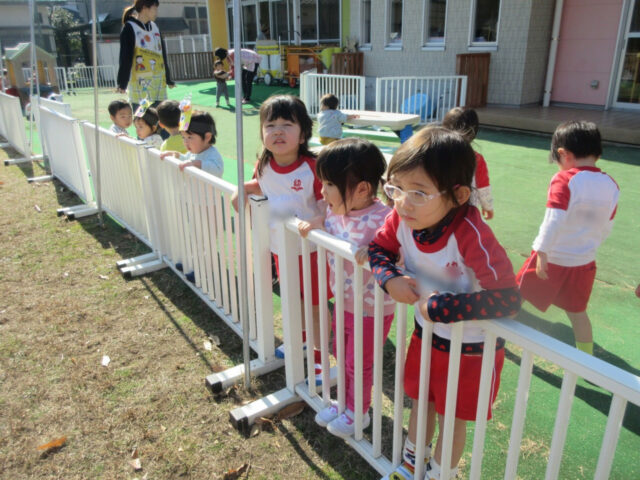 「年長さんがんばれ~」と豆まきが終わったいちご組さんも応援です。
