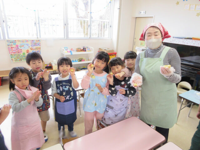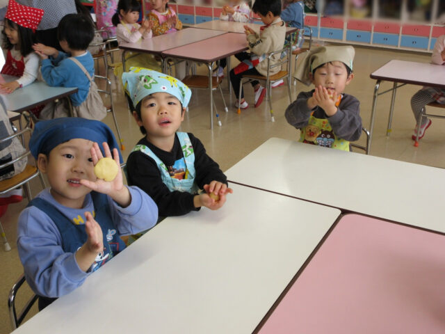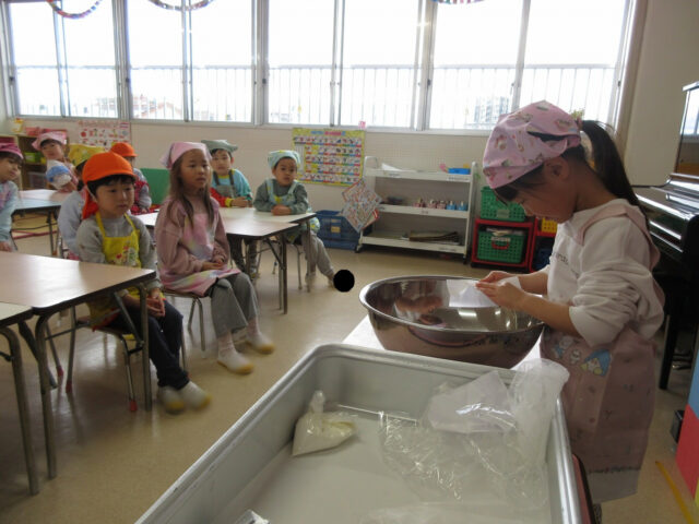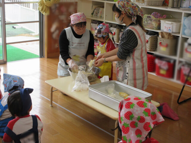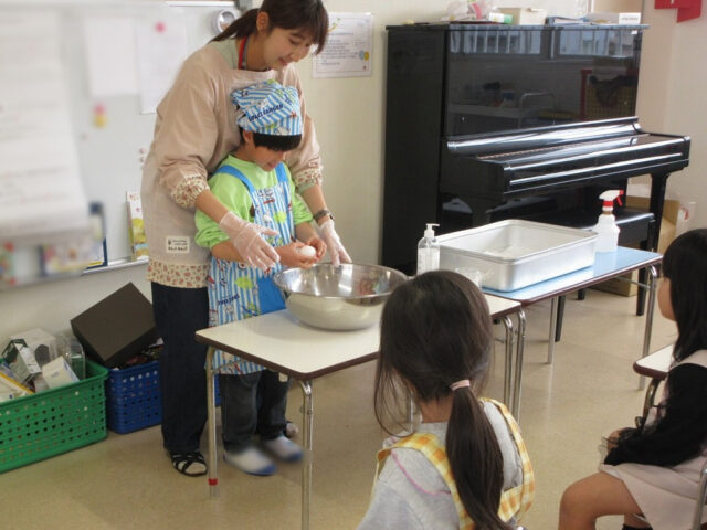 卵を割ったり、砂糖を入れたり等、お手伝いをしてくれる子どもたちが沢山いました。やってみたい!!という気持ちを大切に、ご家庭でもお子様と挑戦してみてください。