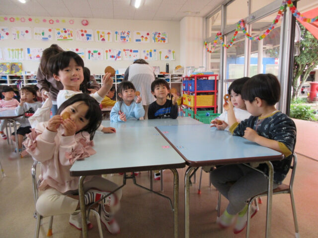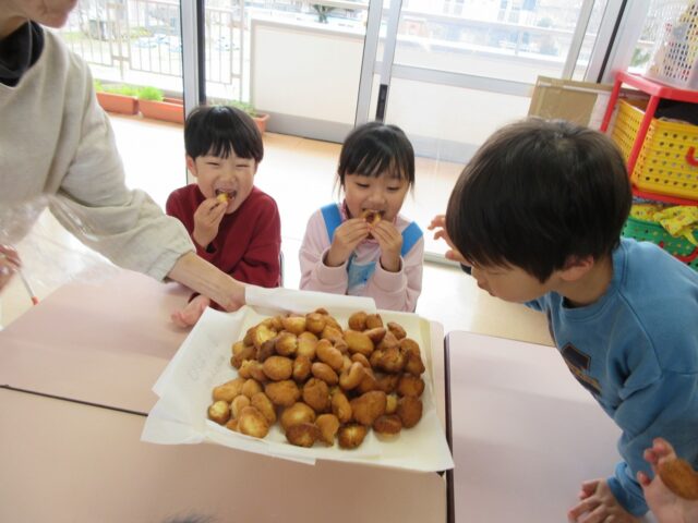 みんなで作ったお菓子を、園長先生・副園長先生・教頭先生・事務の先生方が愛情込めて揚げてくれました!!